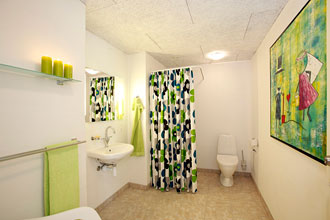 The room has own bathroom and toilet. There is a small nightstand, a small bench and coat hooks with hangers in the room.